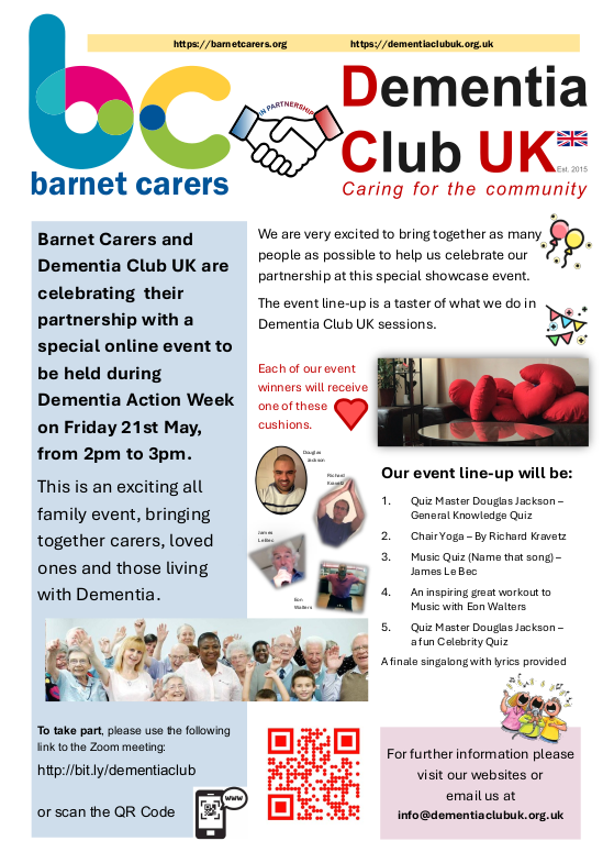 Dementia Club UK is celebrating their partnership with Barnet Carers during Dementia Action Week by hosting a show case event which promises fun and interaction for the whole family, carers and those living with dementia.