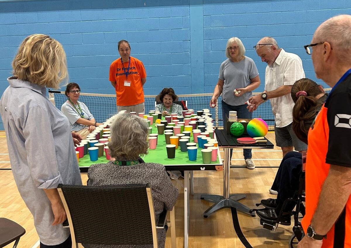 Further down the hall there was plenty more creativity going on with our seated members version of ‘beer pong’ using many colourful cups. This has become another popular activity over the months.