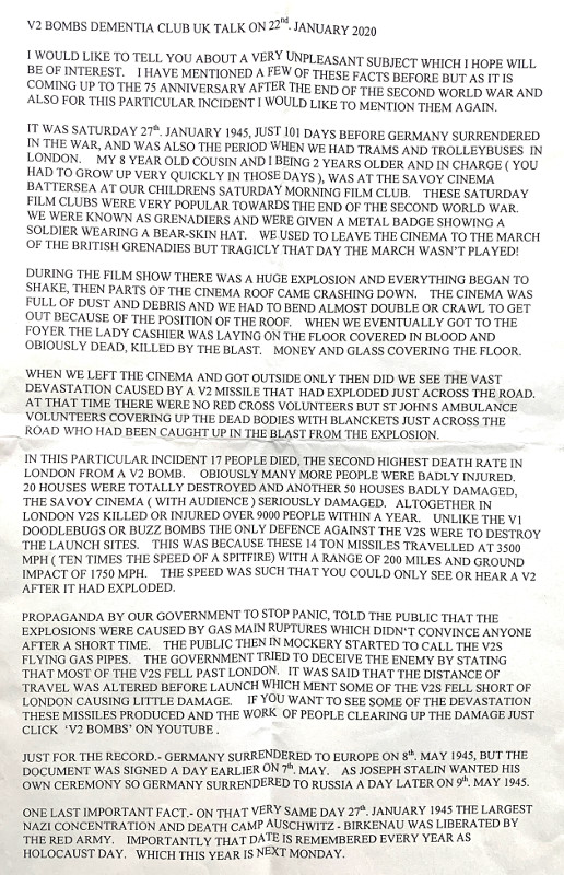 Lisa had to leave early for a meeting in London so Muz and Faz from Ping is King ran the rest of the session. As the 75th Anniversary after the Second World War is approaching, James kicked off the session with a fascinating reading about the V2 missile bombings in the war. He gave a recollection of a horrifying incident on the 27th January 1945 when he was at the Savoy Cinema with his younger cousin. They were aged 10 and 8 at the time. There was a huge explosion which brought down the cinema and James and his cousin remember the devastation it caused and the number of people who died. They were lucky but this is a memory they will not forget. A full transcript of James story is below.